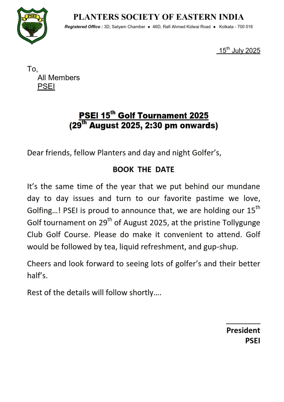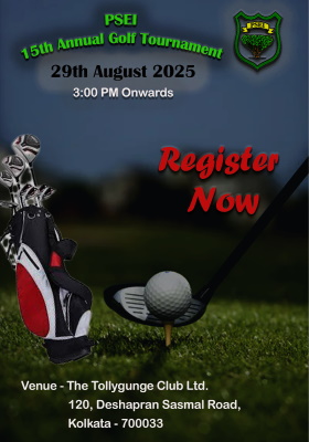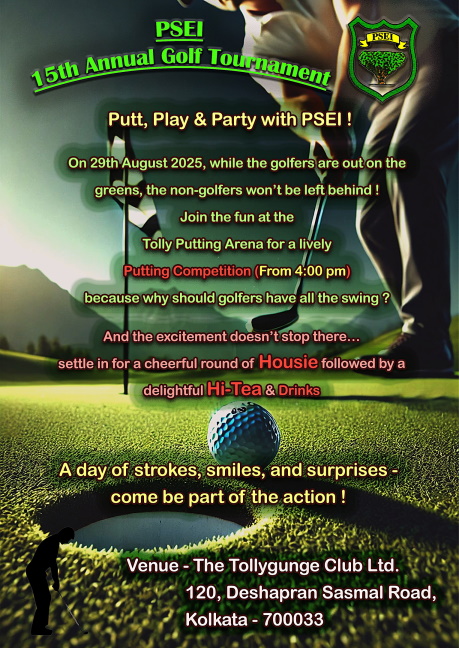 PSEI Annual Golf Tournament to start from 2:00 pm followed by Housie game with drinks and Hi-Tea from 6:30 PM at Veedol Hall, The Tollygunge Club.