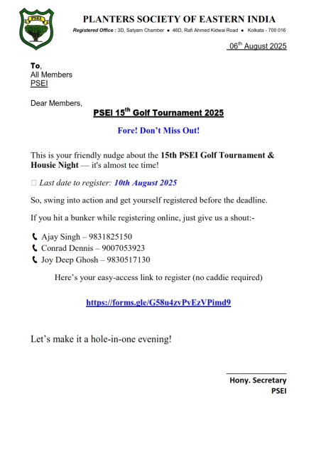 Planters’ Society of Eastern India is a place for All Planters, Executives of the Plantations & division of any Company, those engaged in the Medical Services, Research body or Stipendiary in Plantations and Business Planters, who have served for a reasonable number of years in their respective posts or contributed significantly to the welfare of the Planting Community, to meet and discuss, share ideas and friends. Established in 1999, it boasts of some eminent members from the Industry.